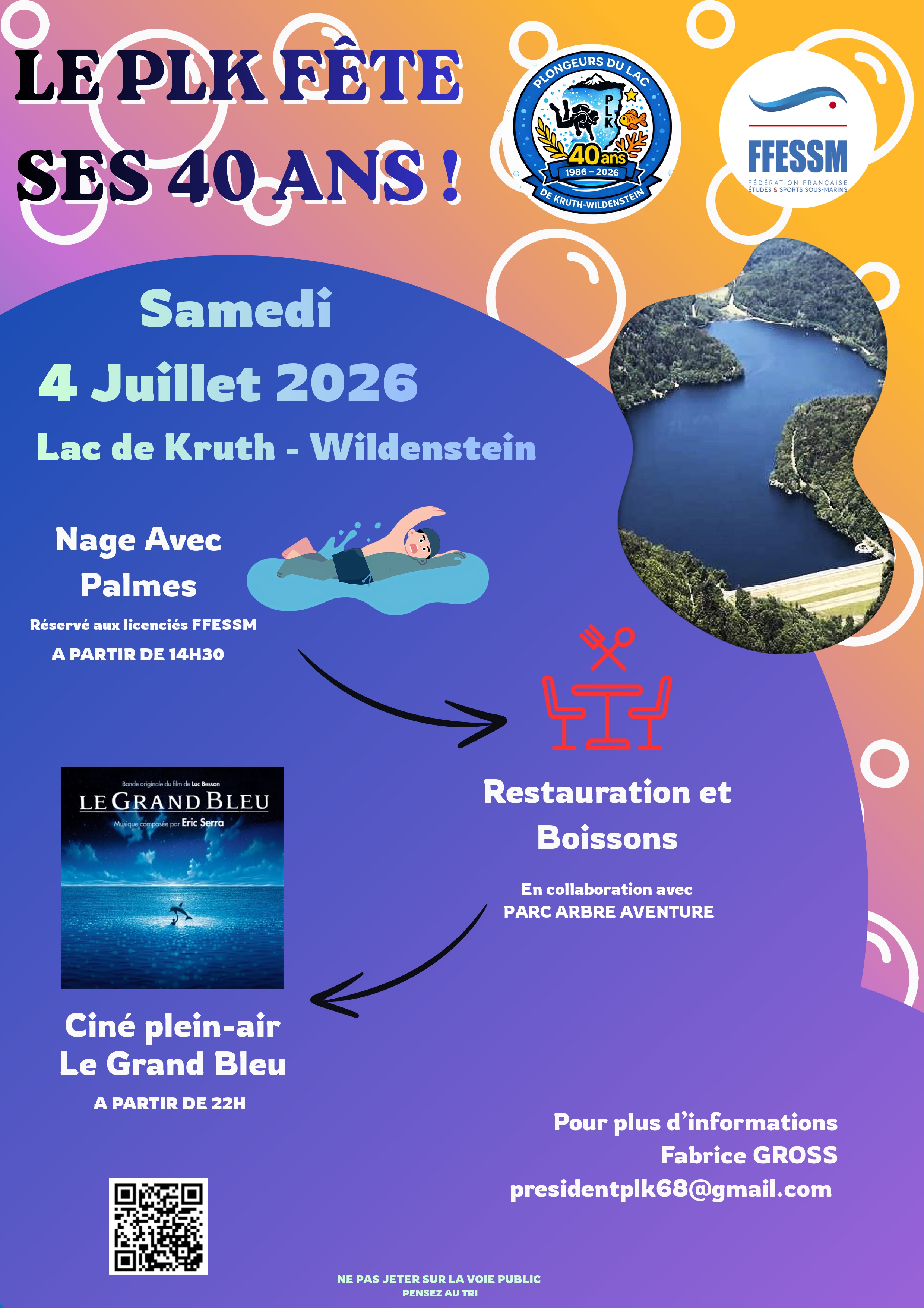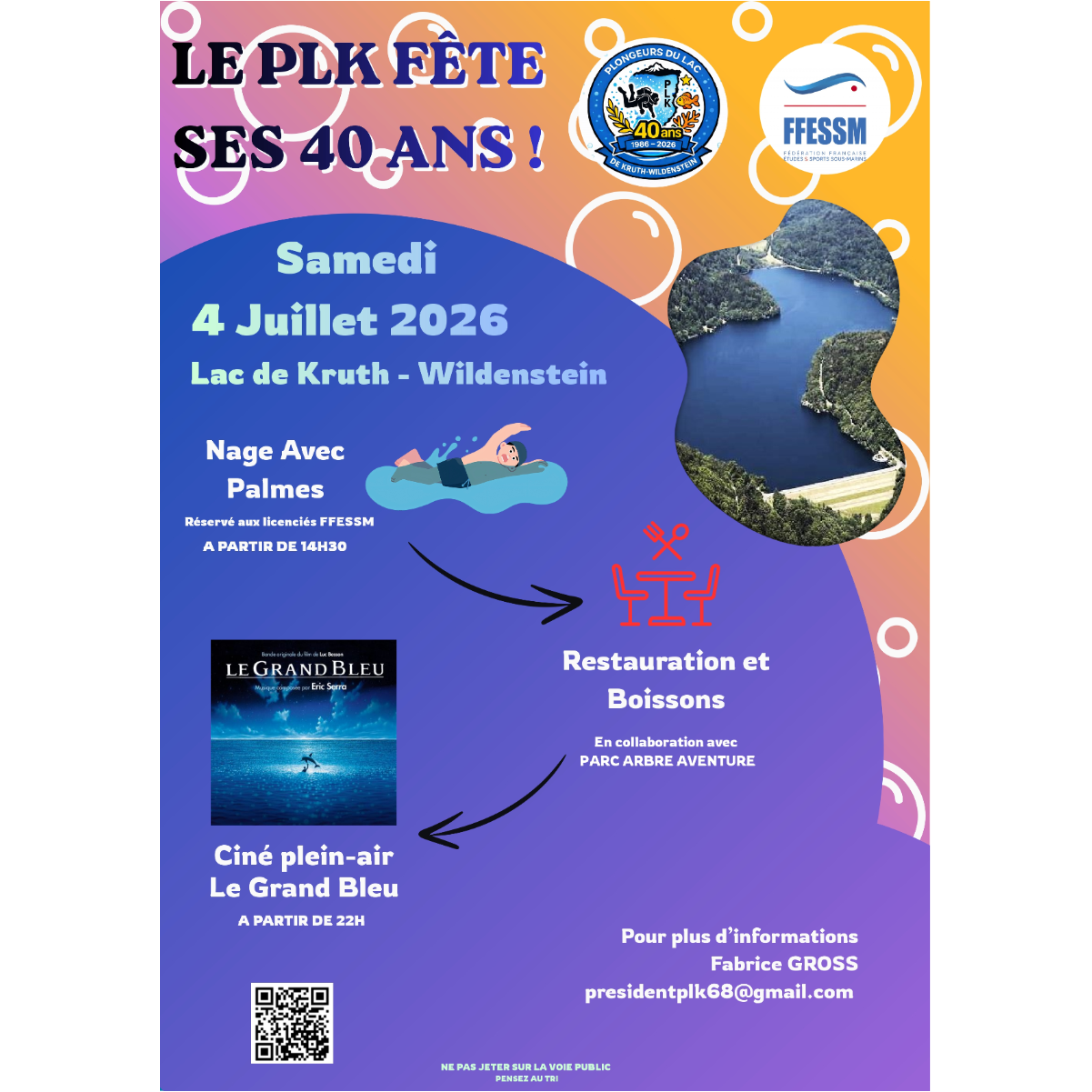 A l'occasion de ses 40 ans, l'association PLK (plongeurs du lac de Kruth) vous invite à venir fêter cet évènement avec eux.